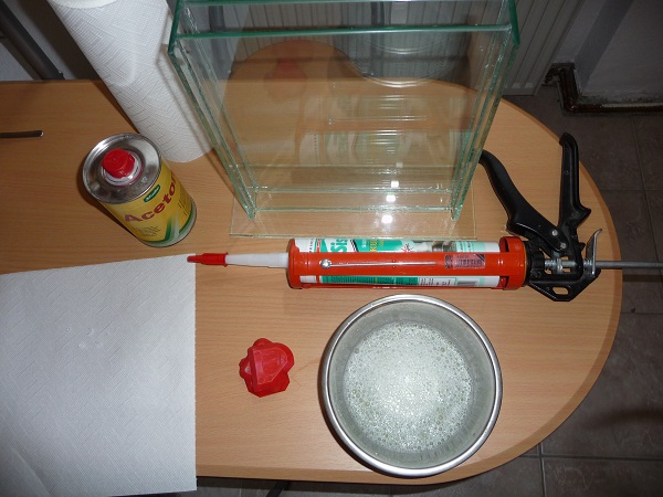 Die Glasplatten habe ich natürlich wieder verwendet. Aber es war ne Heidenarbeit das alte Silikon restlos zu entfernen. Zusammengeklebt habe ich das Glas diesmal mit Dohse Unterwasserkleber und anschließend mit Sista Küchen Silikon verfugt. Beide Sachen habe ich vorher erfolgreich in der Säure und dem Entwickler getestet.